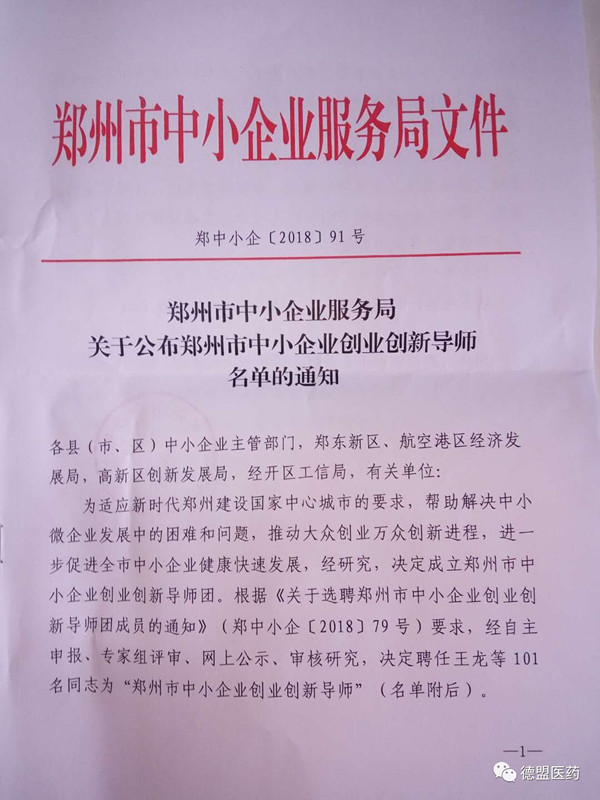 為加強(qiáng)鄭州市中小企業(yè)創(chuàng)業(yè)創(chuàng)新導(dǎo)師團(tuán)的管理服務(wù),充分利用好中小企業(yè)創(chuàng)業(yè)創(chuàng)新導(dǎo)師資源,廣泛開展導(dǎo)師進(jìn)園區(qū)、進(jìn)平臺(tái)、進(jìn)基地公益性巡回服務(wù)活動(dòng),為中小企業(yè)創(chuàng)業(yè)創(chuàng)新提供優(yōu)質(zhì)專業(yè)服務(wù)。中小企業(yè)創(chuàng)業(yè)創(chuàng)新導(dǎo)師要樹立服務(wù)思想,發(fā)揚(yáng)導(dǎo)師精神,奉獻(xiàn)智慧熱情,傳播創(chuàng)業(yè)創(chuàng)新技能,激發(fā)中小企業(yè)創(chuàng)業(yè)創(chuàng)新內(nèi)生動(dòng)力,為推動(dòng)新時(shí)代全市中小企業(yè)高質(zhì)量發(fā)展做出貢獻(xiàn)。近日,鄭州市中小企業(yè)服務(wù)局,經(jīng)研究,決定成立鄭州市中小企業(yè)創(chuàng)業(yè)創(chuàng)新導(dǎo)師團(tuán)。根據(jù)《關(guān)于選聘鄭州市中小企業(yè)創(chuàng)業(yè)創(chuàng)新導(dǎo)師團(tuán)成員的通知》(鄭中小企〔2018〕79號(hào))要求,經(jīng)自主申報(bào)、專家組評(píng)審、網(wǎng)上公示、審核研究,決定聘任王龍等101名同志。河南德盟醫(yī)藥科技有限公司銷售總監(jiān)楊瀾被評(píng)為“鄭州市中小企業(yè)創(chuàng)業(yè)創(chuàng)新導(dǎo)師”。