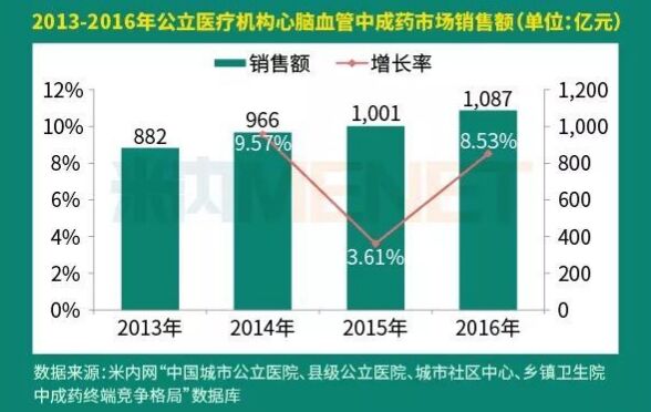近年來,心腦血管疾病發(fā)病率高居不下,特別是中老年人,每年都患病人數(shù)都在緩步增長。根據(jù)國家心血管病中心在2017年發(fā)布的《中國心血管病報告2016》中顯示,現(xiàn)有心血管病患病人數(shù)約2.9億人,且死亡率高于腫瘤和其他疾病。故而心腦血管用藥市場也愈加龐大,在2016年中,公立醫(yī)療機構(gòu)終端心腦血管中成藥銷售額達(dá)到了1087億元。