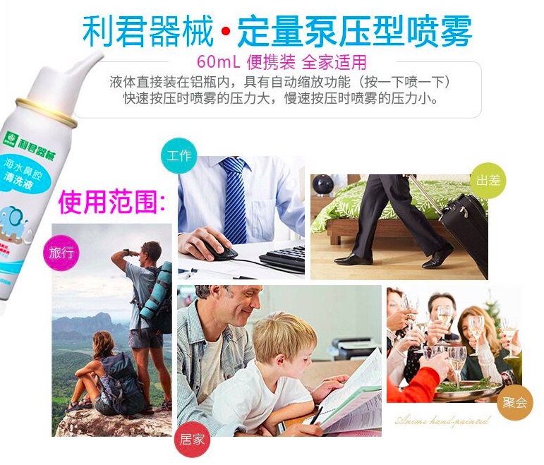 海水鼻腔清洗液由噴霧瓶和噴霧溶液{純化水和海水組成,海水由(純化水+海鹽溶解制成)構(gòu)成。可用于急慢性鼻炎、過(guò)敏性鼻炎、鼻息肉、鼻竇炎等鼻腔疾病患者的鼻腔清洗,也用于鼻炎手術(shù)后的鼻腔清洗。