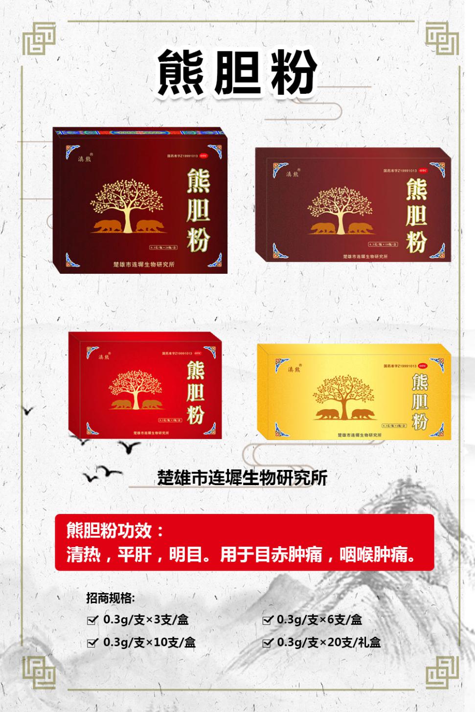 目前,由于肝病的發(fā)病率攀升,熊膽粉的銷量也在增加。楚雄市連墀生物研究所旗下的四款熊膽粉備受歡迎和認可。它們是經國家藥監(jiān)局批準的全國4個OTC批文之一:國藥準字Z19991013,不僅療效有保障,對代理商而言不僅銷量有保障,而且容易上量,已操作,不容錯過!