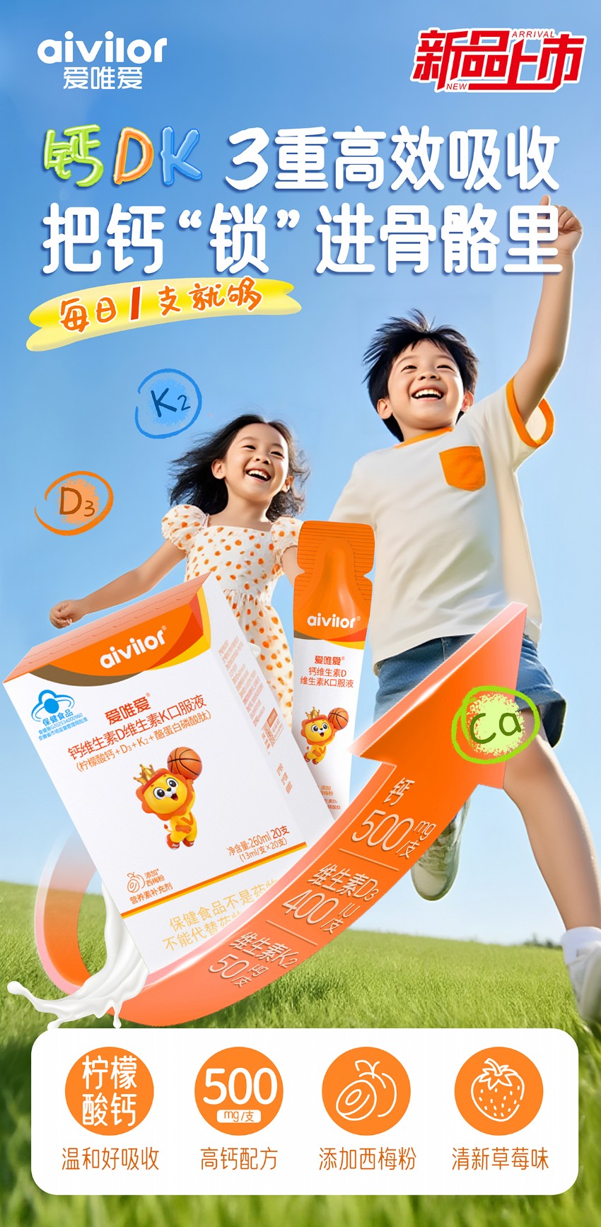 從“補(bǔ)得進(jìn)”到“留得住”|愛唯愛鈣維生素D維生素K口服液以液體小分子技術(shù)+酪蛋白磷酸肽,開啟補(bǔ)鈣3.
