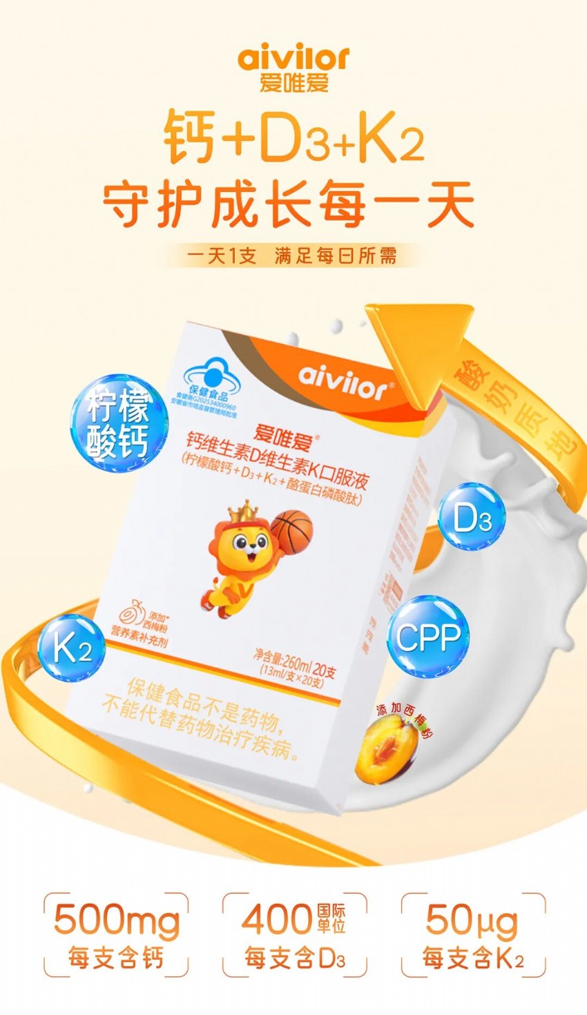 愛唯愛鈣維生素 D 維生素 K 口服液,作為專為中國家庭研發(fā)的科學補鈣方案,用 “鈣 + D3+K2+CPP” 的黃金配方,讓每一份鈣質(zhì)都能穩(wěn)穩(wěn) “鎖” 進骨骼里。