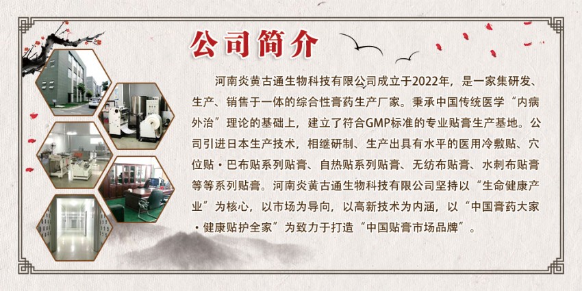 在快節(jié)奏的現(xiàn)代生活中,頸肩腰腿痛、日常小傷痛、肌膚不適等問題時常困擾著人們。傳承中國傳統(tǒng)醫(yī)學(xué)智慧,融合現(xiàn)代科技力量,河南炎黃古通生物科技有限公司應(yīng)運而生,以 “中國膏藥大家,健康貼護(hù)全家” 為理念,深耕健康產(chǎn)業(yè),為大眾帶來多系列高品質(zhì)貼膏及護(hù)理產(chǎn)品,成為值得信賴的健康守護(hù)者。