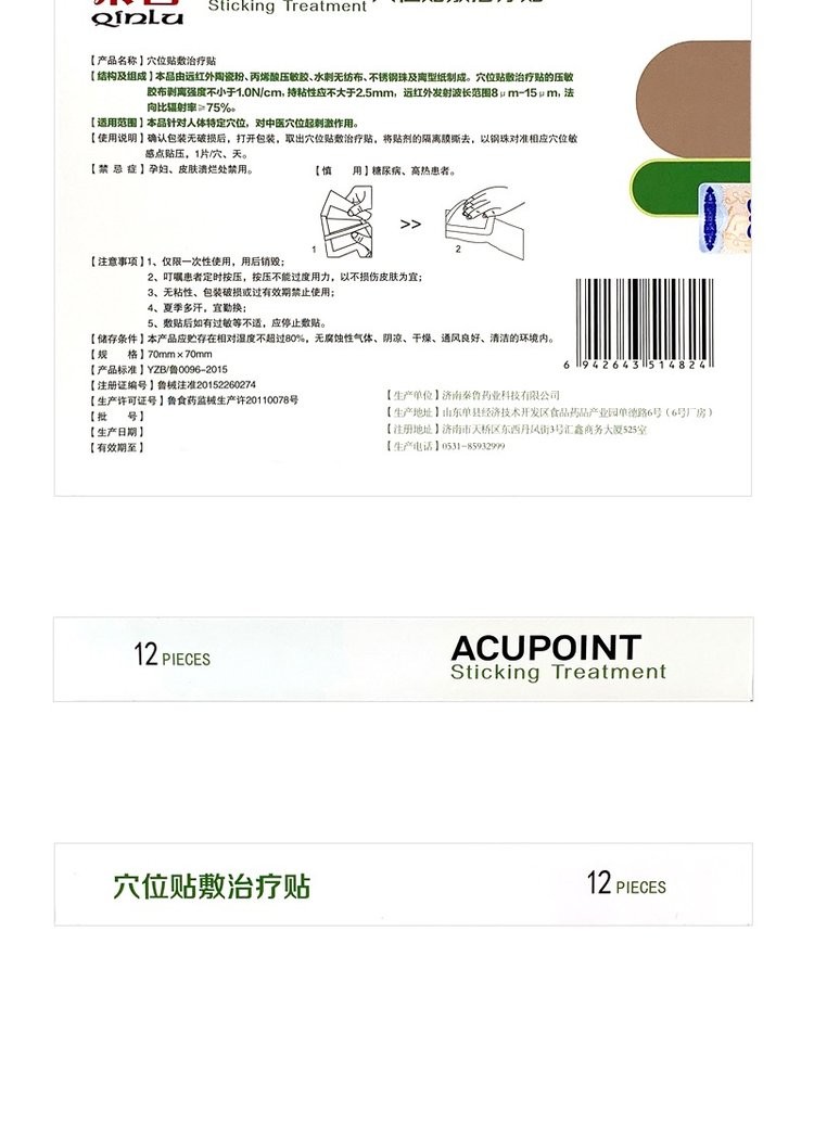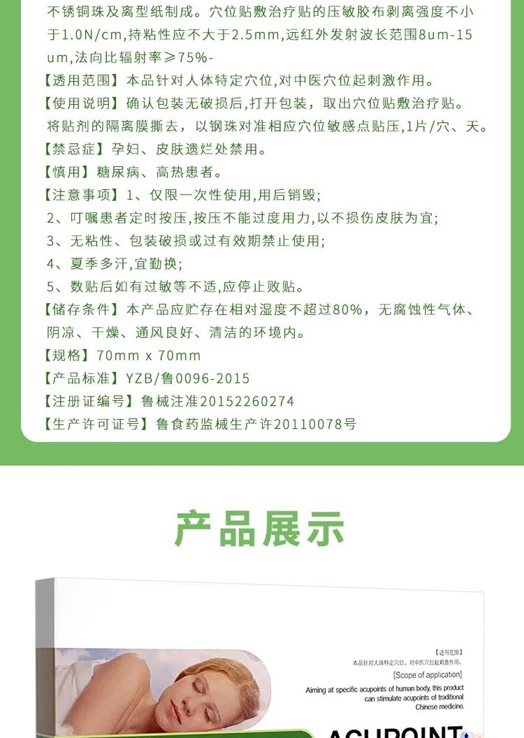 【主要結(jié)構(gòu)】本品由遠(yuǎn)紅外陶瓷粉,丙烯酸壓敏膠,水刺無紡布,不銹鋼珠及離型紙制成。穴位貼敷治療貼的壓敏膠布剝離度不小于1.0N/cm,持粘性應(yīng)不大于2.5mm。遠(yuǎn)紅外發(fā)射波長(zhǎng)范圍8μm-15μm,法向比輻射率≥75%。