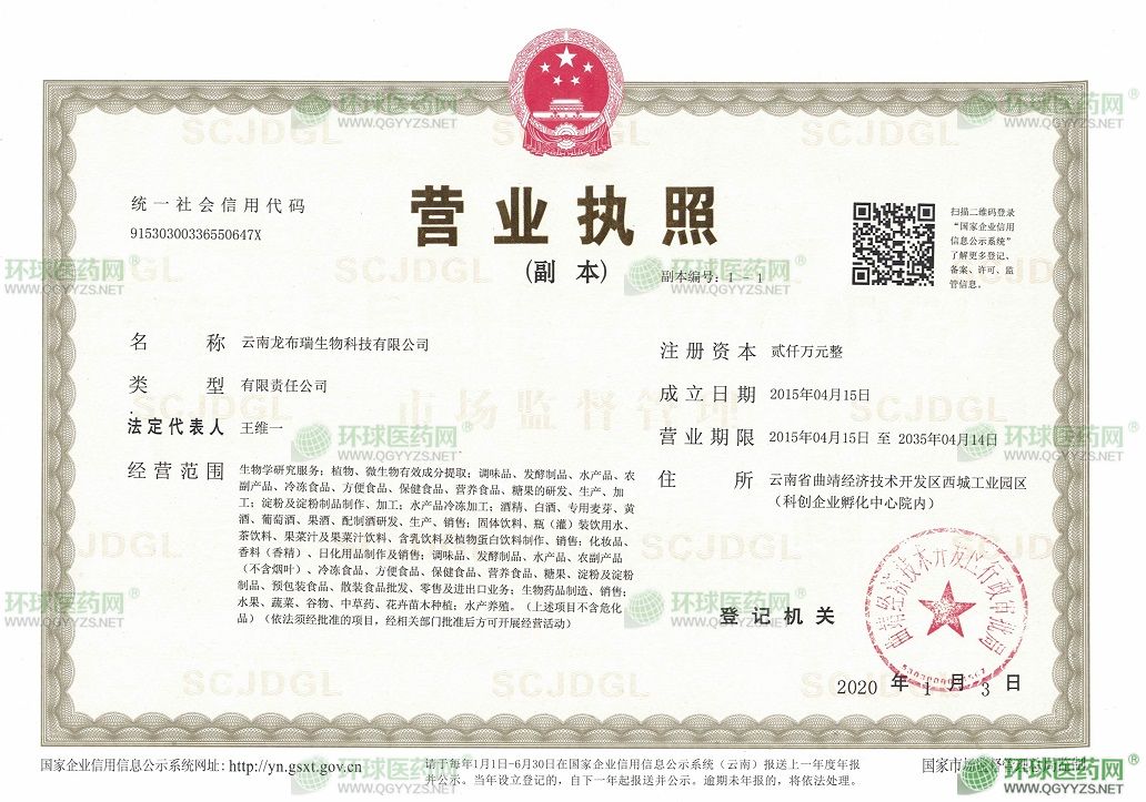 云南龍布瑞生物科技有限公司成立于2015年04月15日,注冊(cè)地位于云南省曲靖市麒麟?yún)^(qū)西城工業(yè)園區(qū)(科創(chuàng)孵化內(nèi)),法人代表為王**。經(jīng)營(yíng)范圍包括生物學(xué)研究服務(wù);植物、微生物有效成分提取;調(diào)味品、發(fā)酵制品、水產(chǎn)品、農(nóng)副產(chǎn)品、冷凍食品、方便食品、保健食品、營(yíng)養(yǎng)食品、糖果的研發(fā)、生產(chǎn)、加工;淀粉及淀粉制品制作、加工;水產(chǎn)品冷凍加工;酒精、白酒、專(zhuān)用麥芽、黃酒、葡萄酒、果酒、配制酒研發(fā)、生產(chǎn)、銷(xiāo)售;固體飲料、瓶(灌)裝飲用水、茶飲料、果菜汁及果菜汁飲料、含乳飲料及植物蛋白飲料制作、銷(xiāo)售;化妝品、香料(香精)、日化用品制作及銷(xiāo)售;調(diào)味品、發(fā)酵制品、水產(chǎn)品、農(nóng)副產(chǎn)品(不含煙葉)、冷凍食品、方便食品、保健食品、營(yíng)養(yǎng)食品、糖果、淀粉及淀粉制品、預(yù)包裝食品、散裝食品批發(fā)、零售及進(jìn)出口業(yè)務(wù);生物藥品制造、銷(xiāo)售;水果、蔬菜、谷物、中草藥、花卉苗木種植;水產(chǎn)養(yǎng)殖。(上述項(xiàng)目不含;罚ㄒ婪毥(jīng)批準(zhǔn)的項(xiàng)目,經(jīng)相關(guān)部門(mén)批準(zhǔn)后方可開(kāi)展經(jīng)營(yíng)活動(dòng))云南龍布瑞生物科技有限公司具有1處分支機(jī)構(gòu)。