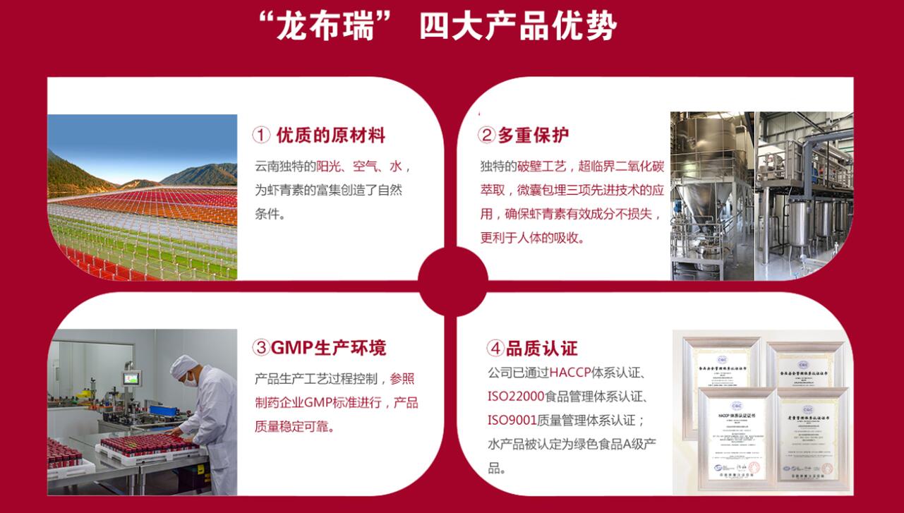 云南龍布瑞蝦青素魅力之二:四大產(chǎn)品優(yōu)勢(shì)—優(yōu)質(zhì)的原材料、多重保護(hù)、GMP生產(chǎn)環(huán)境、品質(zhì)認(rèn)證。