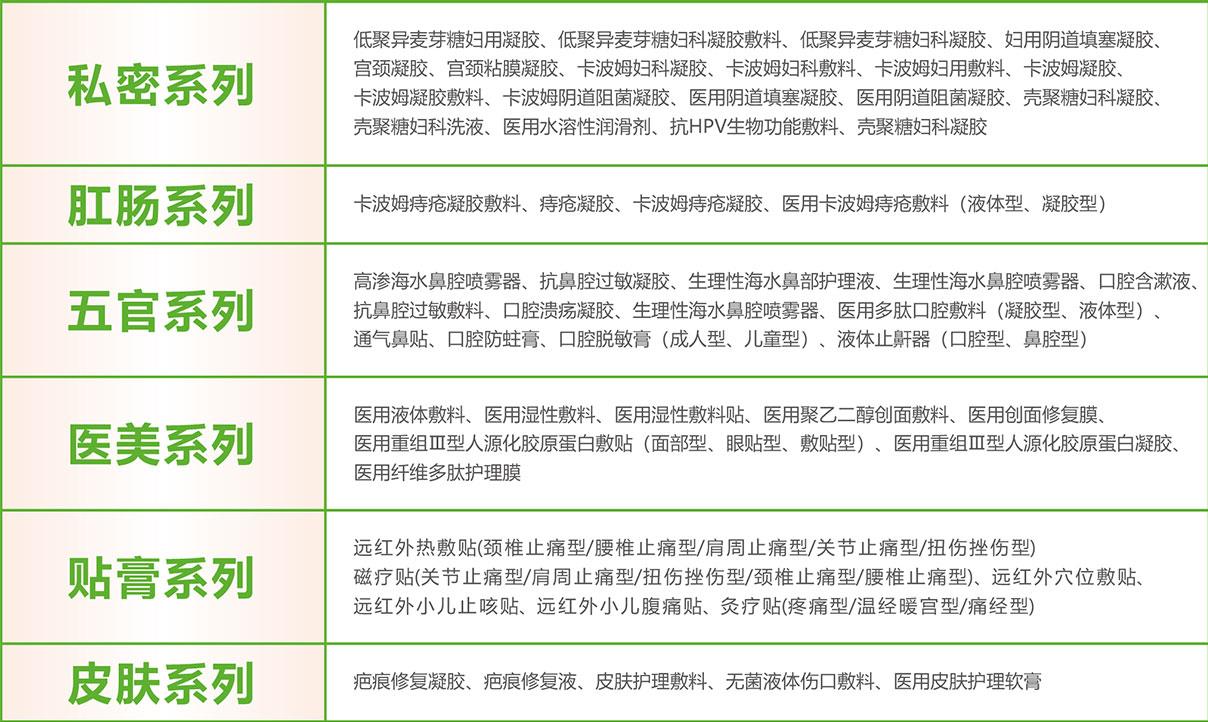 集團(tuán)業(yè)務(wù)板塊主要有:二類醫(yī)療器械、消字號(hào)、妝字號(hào)、保健食品、健字號(hào)、日用號(hào)等大健康全系列產(chǎn)品。佰氏健康集團(tuán)擁有的二類醫(yī)療器械批文有上百個(gè),涉及私密系列、肛腸系列、五官系列、醫(yī)美系列、貼膏系列、皮膚系列等。涉及的產(chǎn)品可見下圖。