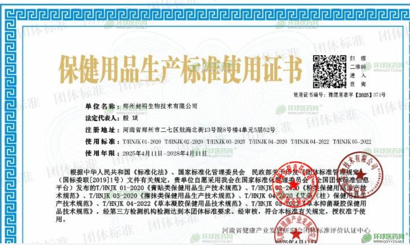 - 保健用品生產(chǎn)標(biāo)準(zhǔn)使用證書