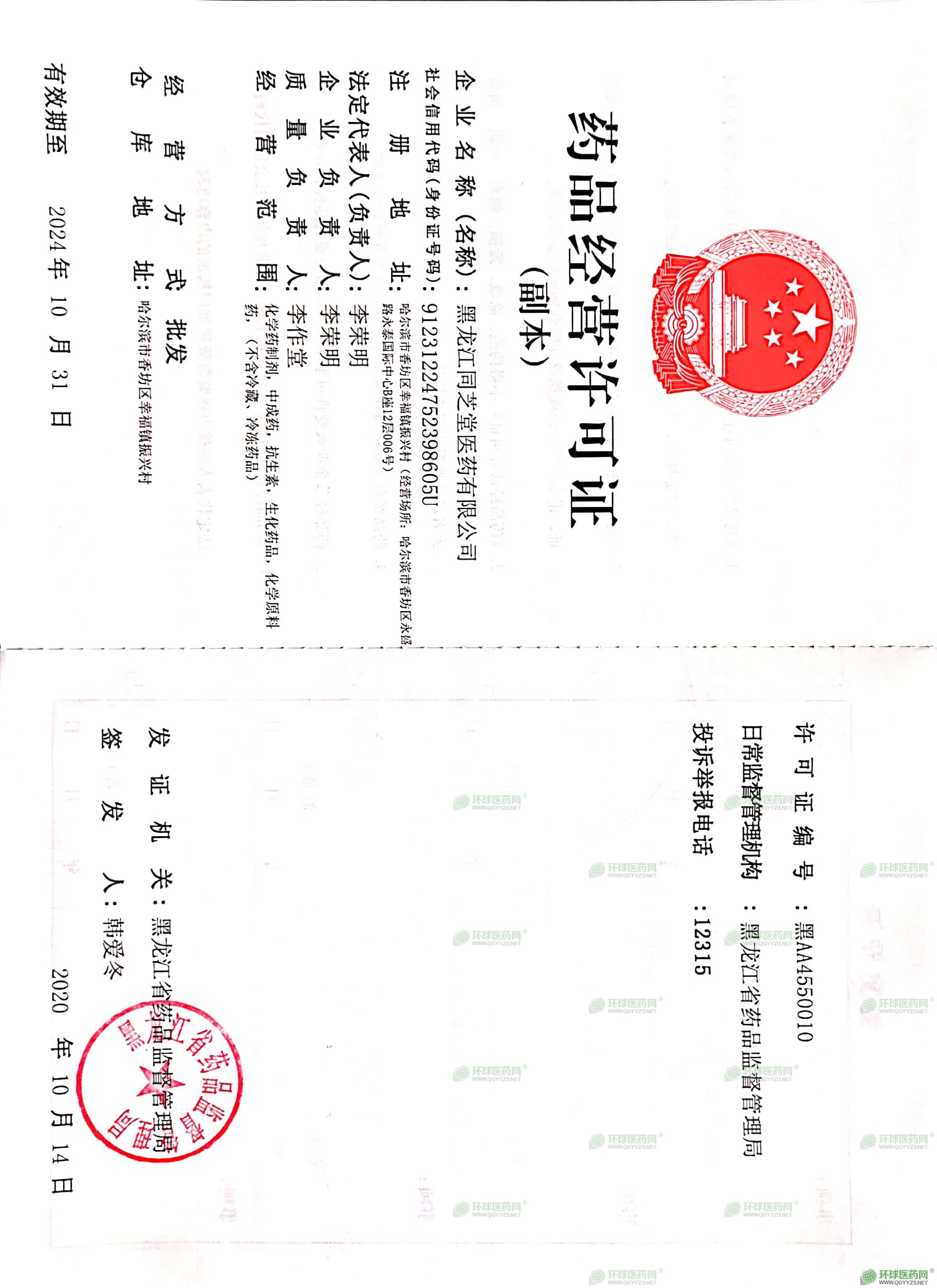 黑龍江同芝堂醫(yī)藥有限公司,注冊地址哈爾濱市香坊區(qū)幸福鎮(zhèn)振興村,法定代表人李榮明。經營范圍包括批發(fā):化學藥制劑,中成藥、抗生素、生化藥品、化學原料藥(不含冷藏、冷凍藥品)