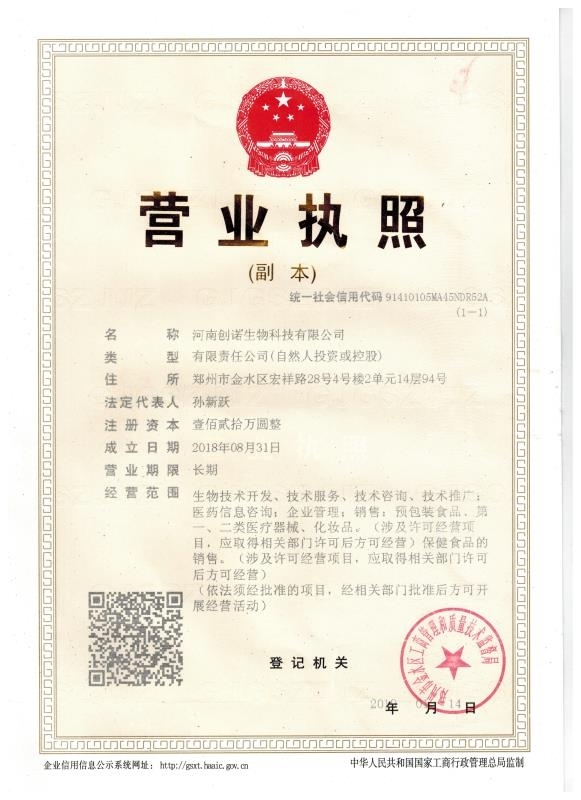 河南創(chuàng)諾生物科技有限公司成立于2018年08月31日,注冊(cè)地位于鄭州市金水區(qū)宏祥路28號(hào)4號(hào)樓2單元14層94號(hào),法定代表人為孫新躍。經(jīng)營(yíng)范圍包括生物技術(shù)開發(fā)、技術(shù)服務(wù)、技術(shù)咨詢、技術(shù)推廣;醫(yī)藥信息咨詢;企業(yè)管理;銷售:預(yù)包裝食品、**、二、三類醫(yī)療器械、化妝品、消殺用品、日用百貨、安防產(chǎn)品。