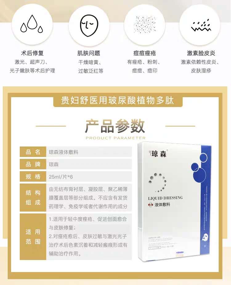瓊森冷敷敷料配合科學技術(shù),將降溫、補水、修復完美結(jié)合。通過聚乙烯酵水凝膠中的水分持續(xù)毛細血管作用,可使皮膚快速降溫鎮(zhèn)靜,減緩痛感,透明質(zhì)酸鈉對皮膚具有強大的保濕及修復作用。
