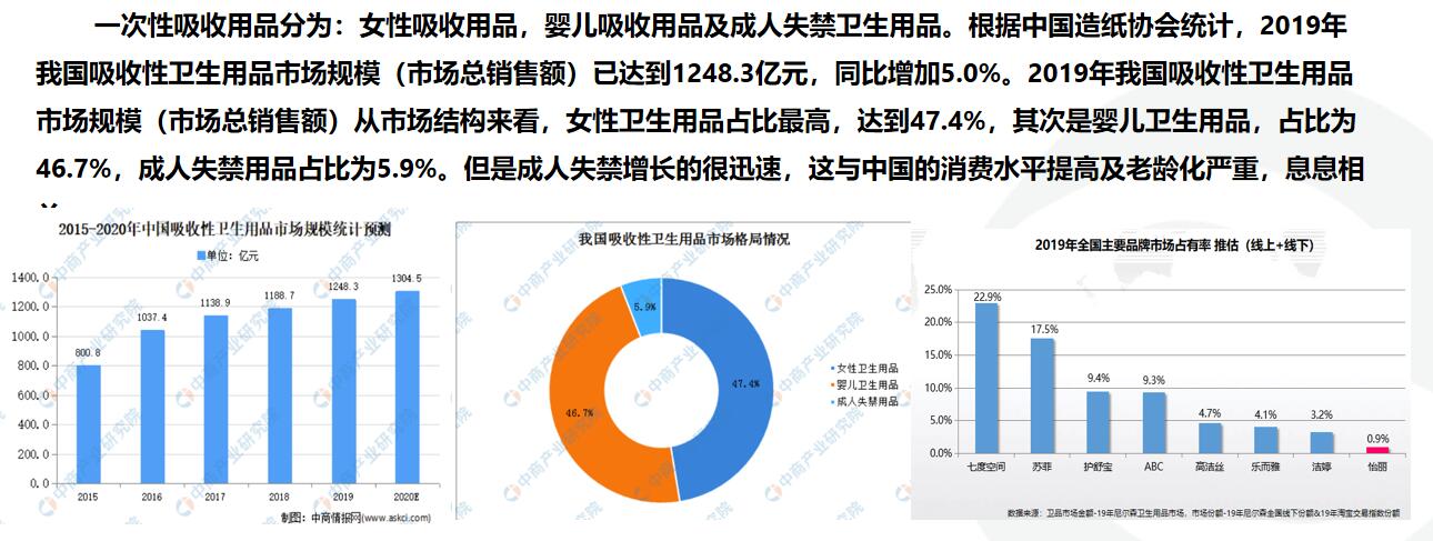 一次性吸收用品分為:女性吸收用品,嬰兒吸收用品及成人失禁衛(wèi)生用品。根據(jù)中國造紙協(xié)會統(tǒng)計,2019年我國吸收性衛(wèi)生用品市場規(guī)模(市場總銷售額)已達到1248.3億元,同比增加5.0%。2019年我國吸收性衛(wèi)生用品市場規(guī)模(市場總銷售額)從市場結(jié)構(gòu)來看,女性衛(wèi)生用品占比*高,達到47.4%,其次是嬰兒衛(wèi)生用品,占比為46.7%,成人失禁用品占比為5.9%。但是成人失禁增長的很迅速,這與中國的消費水平提高及老齡化嚴重,息息相關(guān)。