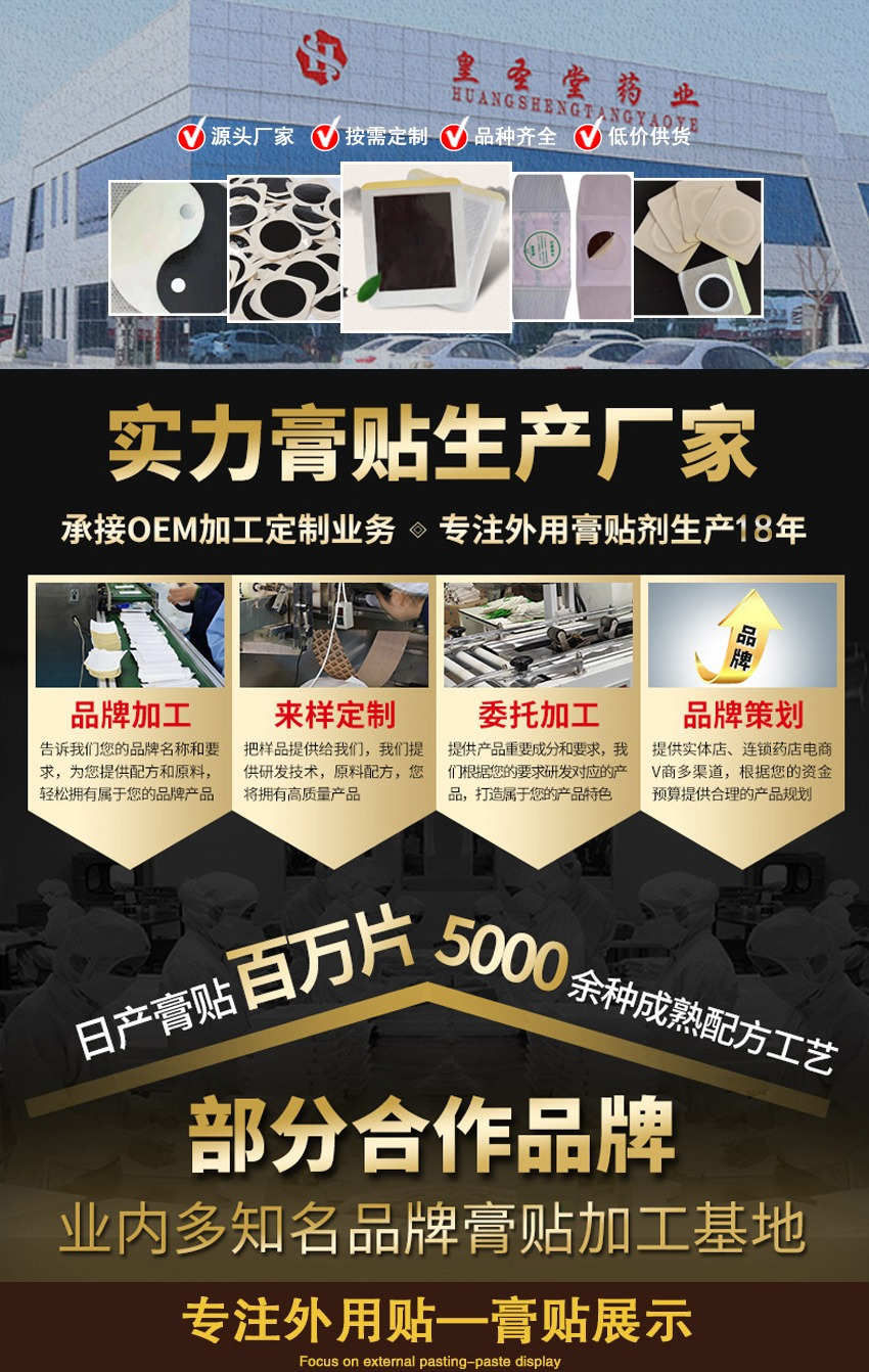 OEM代加工特點(diǎn)OEM.自主品牌加工只需要告訴我們您的品牌名稱,輕松擁有專屬黑膏藥品牌,還可以來料黑膏藥加工,包裝加工,來樣加工,來配方加工。
