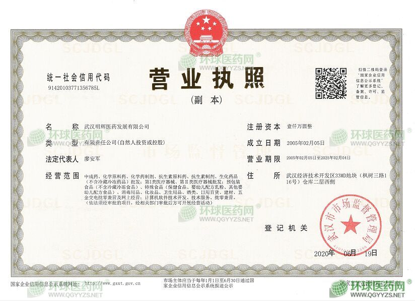 武漢明輝醫(yī)藥發(fā)展有限公司地處武漢經(jīng)濟(jì)開(kāi)發(fā)區(qū)33MD地塊(楓樹(shù)三路116號(hào)),公司于2005年在武漢市工商行政管理局江漢分局登記注冊(cè),公司注冊(cè)資金1000萬(wàn)人民幣,企業(yè)類(lèi)型是有限責(zé)任公司(自然人投資或控股)。目前的經(jīng)營(yíng)范圍是中成藥、中藥飲片、化學(xué)藥制劑、抗生素制劑、生物制品、化學(xué)原料藥、生化藥品、抗生素原料藥批發(fā)。(經(jīng)營(yíng)期限與許可證核定的期限一致)(國(guó)家有專(zhuān)項(xiàng)規(guī)定的項(xiàng)目經(jīng)審批后方可經(jīng)營(yíng))。
