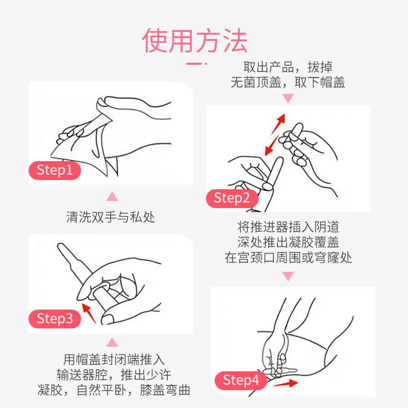【使用方法】晚上睡前清洗外陰后,打開包裝、取出產(chǎn)品,拔掉無菌頂蓋、取下蓋帽,用蓋帽封閉端推入輸送器腔,推出少許凝膠,自然平臥位。膝蓋彎曲,將推進(jìn)器插入陰道深處推出凝膠覆蓋在宮頸口周圍或穹窿處,抽出輸送器棄之。1支/次,1次/日,嚴(yán)重者2支/日,早晚各一支或者遵醫(yī)囑。6支為一個(gè)療程,一般1到2個(gè)療程創(chuàng)面修復(fù)。