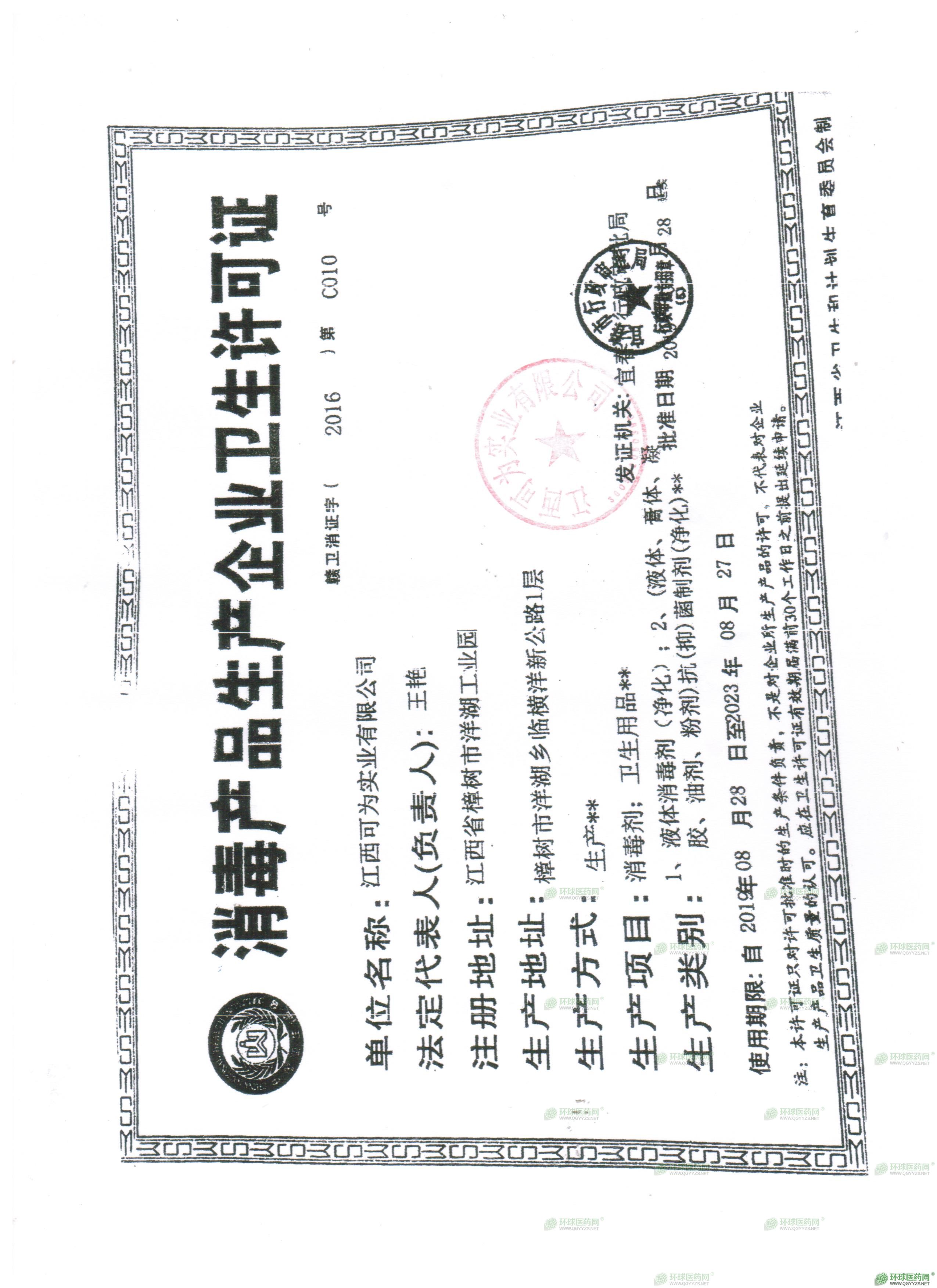 - 消毒產(chǎn)品生產(chǎn)企業(yè)衛(wèi)生許可證