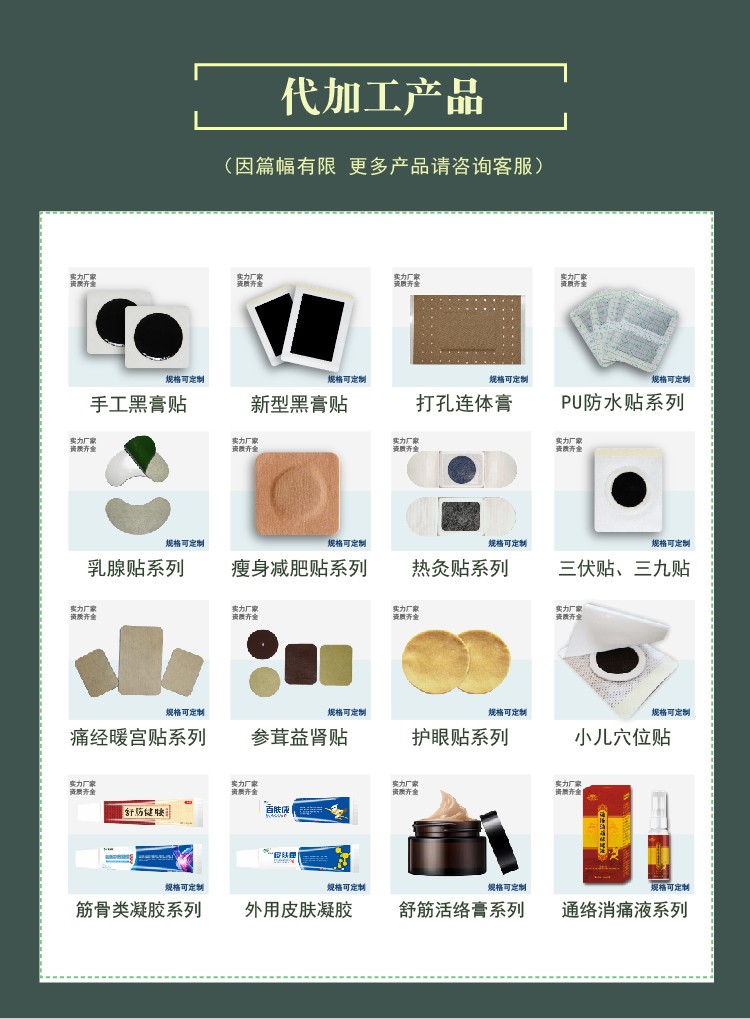 傳統(tǒng)黑膏,巴布貼膏藥加工,熱熔膠貼牌加工、粉包劑膏藥加工,凝膠劑膏藥加工,黑貼膏加工,軟膏乳膏貼牌加工,水劑噴劑貼牌加工,液體敷料加工,化妝品貼牌加工,食品固體飲料/壓片糖果貼牌加工等業(yè)務(wù)。