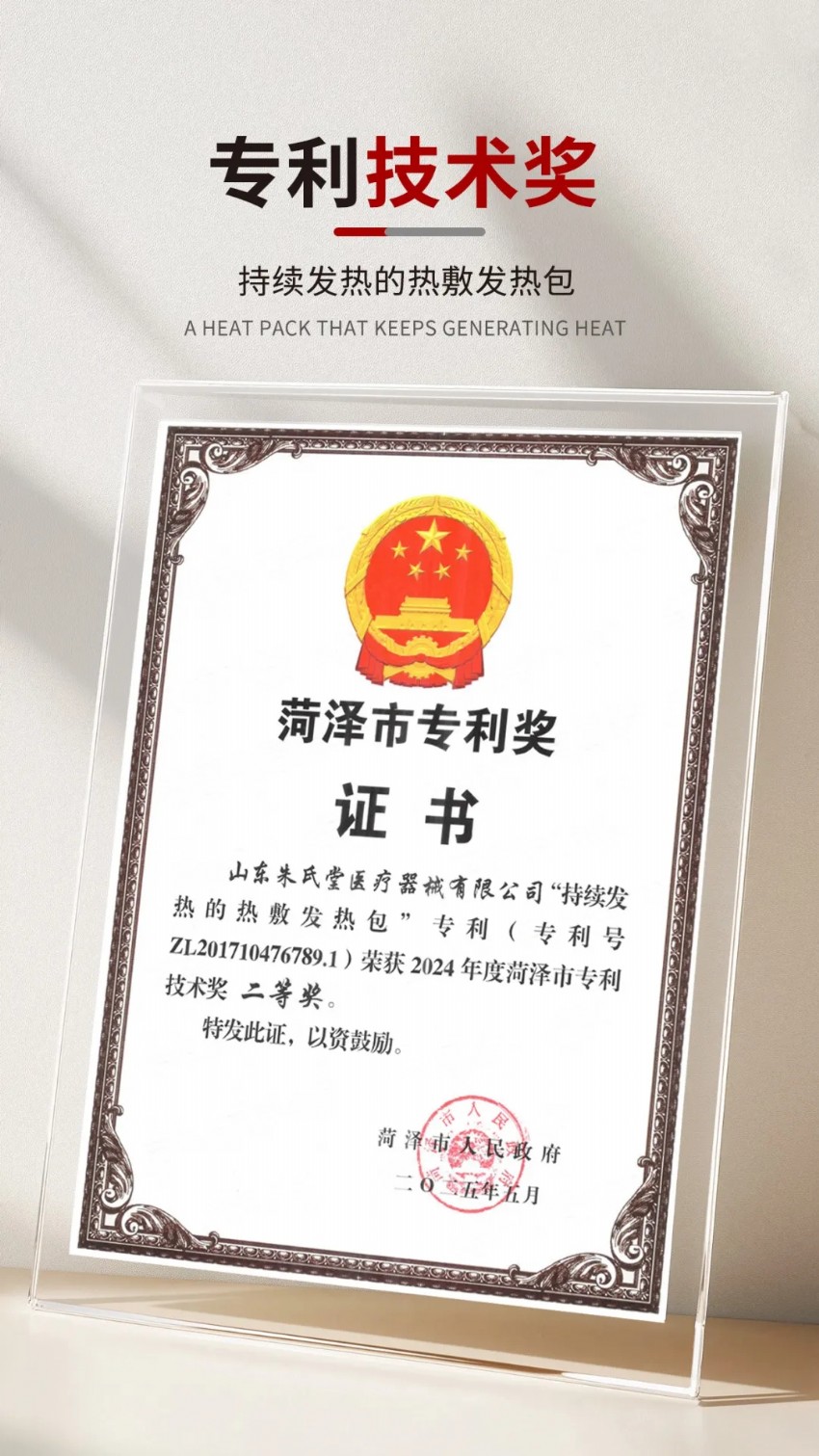 在科技創(chuàng)新的璀璨星空中,山東朱氏堂醫(yī)療器械有限公司憑借雄厚研發(fā)實(shí)力與不懈的創(chuàng)新追求,再次閃耀光芒!公司的“持續(xù)發(fā)熱的熱敷發(fā)熱包” 專利(專利號 ZL201710476789.1)在眾多項(xiàng)目中脫穎而出,榮獲 2024 年度菏澤市專利技術(shù)獎(jiǎng)二等獎(jiǎng),這一榮譽(yù)不僅是對朱氏堂技術(shù)創(chuàng)新的高度認(rèn)可,更是其在醫(yī)療器械領(lǐng)域深耕細(xì)作、砥礪前行的有力見證。