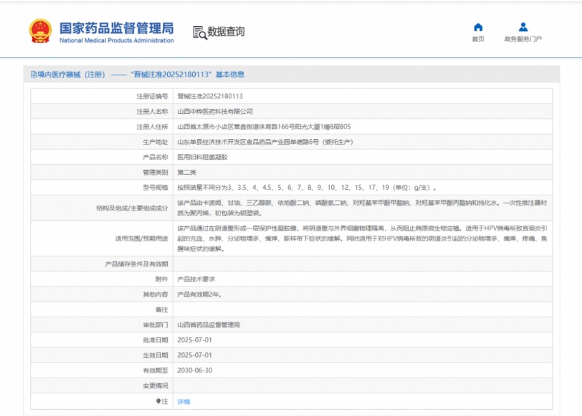 醫(yī)用婦科阻菌凝膠女性的生殖健康一直是備受關(guān)注的話題,婦科疾病的困擾常常給女性的生活帶來(lái)諸多不便。近日,山西中燁醫(yī)藥科技有限公司新下證了一款產(chǎn)品 —— 醫(yī)用婦科阻菌凝膠。醫(yī)用婦科阻菌凝膠生產(chǎn)廠家聯(lián)系電話:17362265742