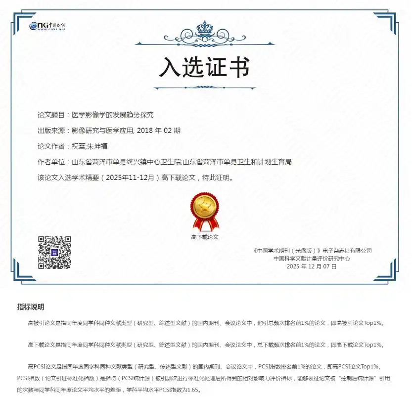 合作成果亮眼:兩篇論文躋身 “高下載 Top1%” 此次入選高下載論文的兩篇合作成果,聚焦醫(yī)療技術(shù)與臨床應(yīng)用領(lǐng)域:其中《醫(yī)學(xué)影像學(xué)的發(fā)展趨勢探究》刊載于《影像研究與醫(yī)學(xué)應(yīng)用》;《東貝遠(yuǎn)紅外磁療貼 (頸椎型) 治療頸型頸椎病療效觀察》發(fā)表在《臨床檢驗雜志》。而根據(jù)證書指標(biāo)說明,“高下載論文” 是指同年度同學(xué)科同類型文獻(xiàn)中總下載頻次排名前 1% 的成果,此次兩篇論文的入選,也直接體現(xiàn)出它們在行業(yè)內(nèi)的高關(guān)注度與實用價值。