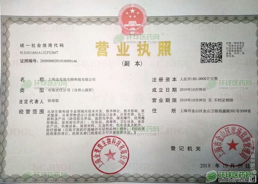 上海金麥浪生物科技有限公司成立于2019年10月09日,注冊地位于上海市金山區(qū)金山衛(wèi)鎮(zhèn)錢鑫路301號3009室,法定代表人為徐恭穩(wěn)。經(jīng)營范圍包括從事生物科技專業(yè)領(lǐng)域內(nèi)技術(shù)開發(fā)、技術(shù)轉(zhuǎn)讓、技術(shù)咨詢、技術(shù)服務(wù),從事貨物進(jìn)出口及技術(shù)進(jìn)出口業(yè)務(wù),日用百貨,化工原料及產(chǎn)品(除危險化學(xué)品、監(jiān)控化學(xué)品、煙花爆竹、民用爆炸物品、易制毒化學(xué)品),化妝品,消毒劑,衛(wèi)生潔具,食用農(nóng)產(chǎn)品,機(jī)械設(shè)備,建筑材料,五金機(jī)電,機(jī)電設(shè)備及配件,醫(yī)療器械(僅限不需醫(yī)療器械許可證的品種)銷售。【依法須經(jīng)批準(zhǔn)的項目,經(jīng)相關(guān)部門批準(zhǔn)后方可開展經(jīng)營活動!