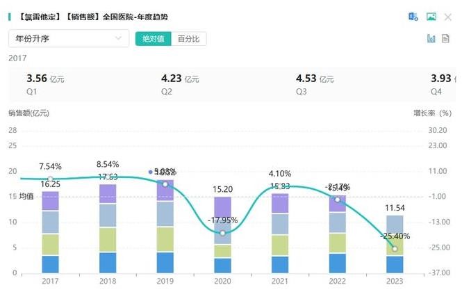 從在全國(guó)院內(nèi)市場(chǎng)來(lái)看,氯雷他定相關(guān)品種的銷售表現(xiàn)尤為亮眼。其總銷售峰值超18億元,顯示出強(qiáng)大的市場(chǎng)潛力。2023年(截至Q3),氯雷他定相關(guān)品種的銷售額已接近12億元,表明其在抗過(guò)敏藥物市場(chǎng)應(yīng)用前景樂(lè)觀。(截圖來(lái)源:藥融云全國(guó)醫(yī)院銷售數(shù)據(jù)庫(kù))