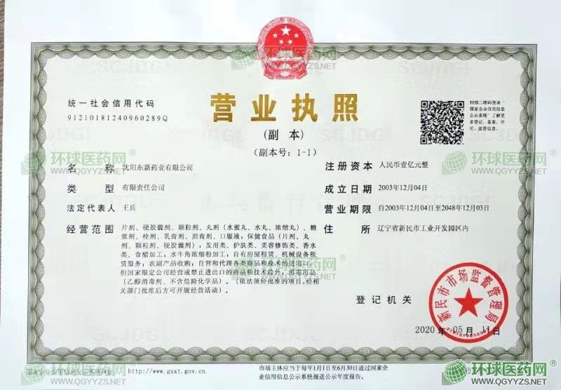 沈陽(yáng)東新藥業(yè)有限公司成立于2003年12月04日,注冊(cè)地位于遼寧省新民市工業(yè)開(kāi)發(fā)園區(qū)內(nèi),法定代表人為王兵。經(jīng)營(yíng)范圍包括片劑、硬膠囊劑、顆粒劑、丸劑(水蜜丸、水丸、濃縮丸)、糖漿劑、栓劑、乳膏劑、煎膏劑、口服液;保健食品(片劑、丸劑、顆粒劑、硬膠囊劑);發(fā)用類、護(hù)膚類、美容修飾類、香水類、食醋加工;水牛角濃縮粉加工;自有房屋租賃、機(jī)械設(shè)備租賃服務(wù);農(nóng)副產(chǎn)品收購(gòu);自營(yíng)和代理各類商品和技術(shù)的進(jìn)出口,但國(guó)家限定公司經(jīng)營(yíng)或禁止進(jìn)出口的商品和技術(shù)除外;消毒用品(乙醇消毒劑、不含危險(xiǎn)化學(xué)品)。(依法須經(jīng)批準(zhǔn)的項(xiàng)目,經(jīng)相關(guān)部門批準(zhǔn)后方可開(kāi)展經(jīng)營(yíng)活動(dòng))。沈陽(yáng)東新藥業(yè)有限公司對(duì)外投資2家公司,具有1處分支機(jī)構(gòu)