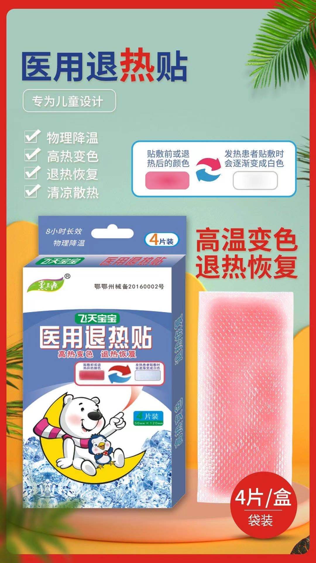 普通退熱貼的升級(jí)版,原粉色膠體,當(dāng)體溫達(dá)到38.5會(huì)變成無色,如果體溫低于38.5,顏色也會(huì)恢復(fù)粉色。高溫變色,退熱回復(fù),方便爸爸媽媽了解小朋友的退燒情況。
