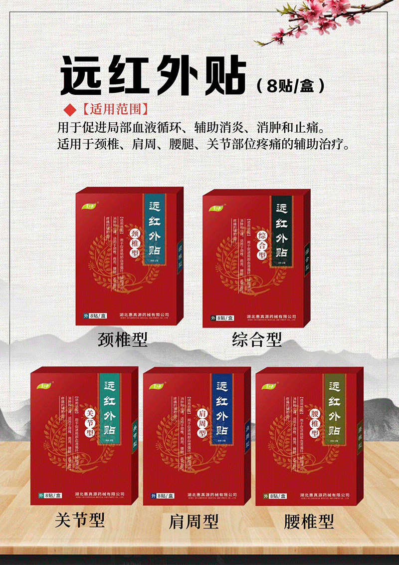 遠(yuǎn)紅外貼有5種類型,分別為頸椎型、綜合型、關(guān)節(jié)型、肩周型和腰椎型,5種類型側(cè)重點(diǎn)不同,代理商和消費(fèi)者可按需選擇。