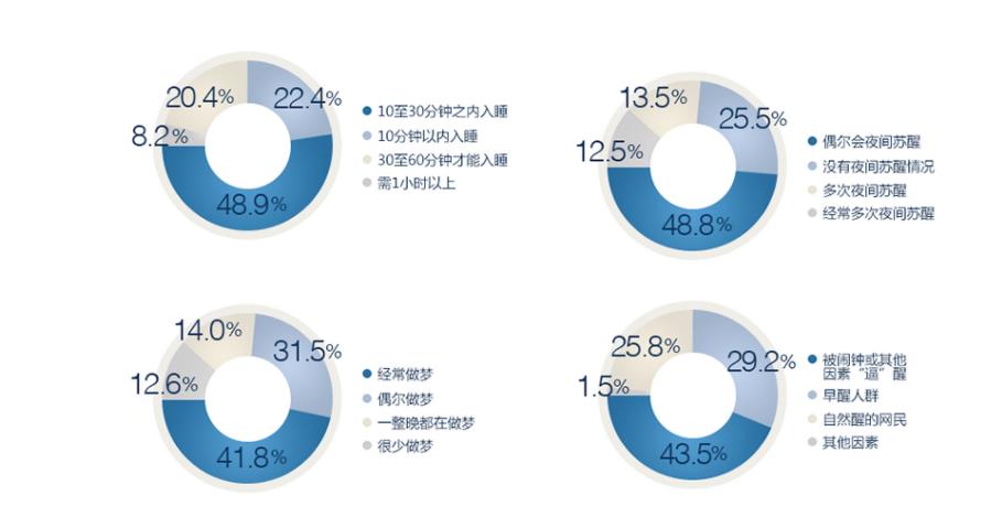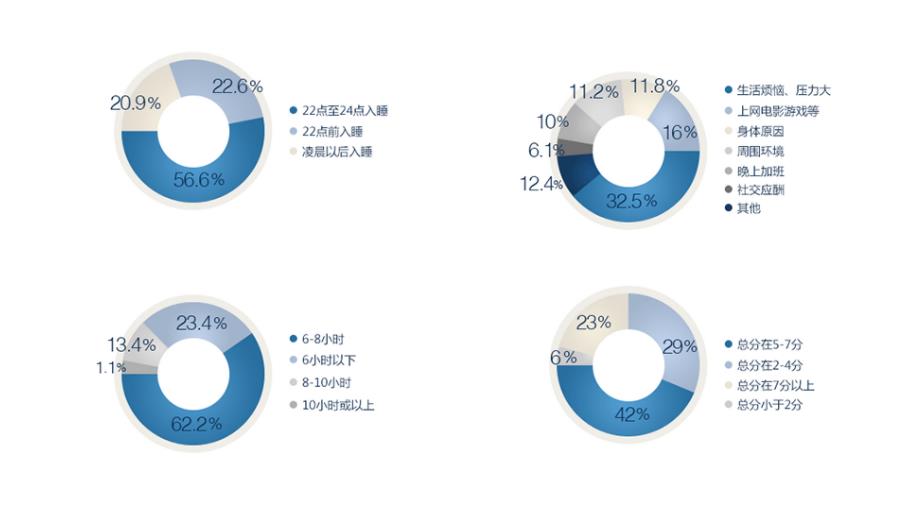 1、調(diào)查表明我國網(wǎng)民普遍睡眠質(zhì)量不高,主要表現(xiàn)有睡眠過多或者過少,深度睡眠不足,包括入睡時(shí)間長、夜間多夢易驚醒、清晨起床困難或易早醒,其中四成人表示會經(jīng)常性的睡不好。