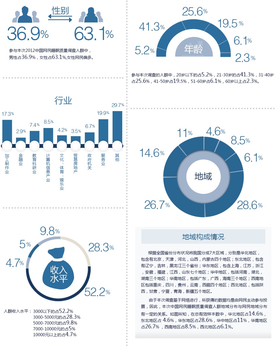 由于本次調(diào)查基于網(wǎng)絡(luò)進(jìn)行,所獲得的數(shù)據(jù)均是由網(wǎng)民主動參與投票,因此,本次中國網(wǎng)民睡眠質(zhì)量調(diào)查人群地域分布與網(wǎng)民地域分布有一定的關(guān)系。如上圖所知,在總有效樣本數(shù)中,華北地區(qū)占14.6%,東北地區(qū)占4.6%,華東地區(qū)占28.6% ,華中地區(qū)占11% ,華南地區(qū)占26.7%,西南地區(qū)占8.5%,西北地區(qū)占6.1%。