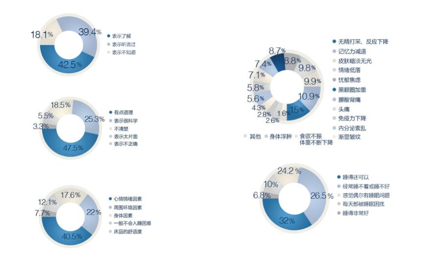 3、人們對深淺睡眠及與睡眠質(zhì)量的關(guān)系有一定的了解,但實(shí)際生活中往往忽視睡眠質(zhì)量,深度睡眠不夠,并且對于如何解決睡眠問題以及如何提高睡眠質(zhì)量問題上,大部分網(wǎng)民是“不理會、不在意”的消極態(tài)度。不過對于睡眠微環(huán)境(如寢具)對睡眠質(zhì)量的影響,大部分人還是表示認(rèn)同的。