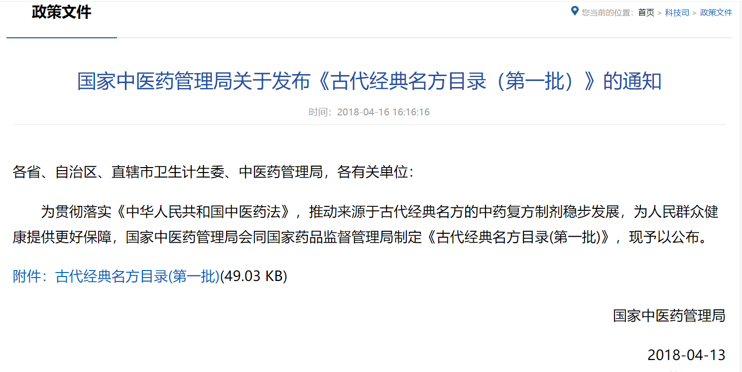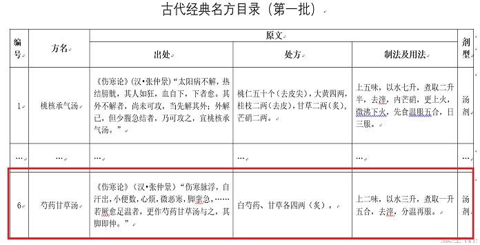 2018年4月13日國家中醫(yī)藥管理局發(fā)布《古代經典名方目錄(**批)》,其中第六首方劑就是“芍藥甘草湯”。