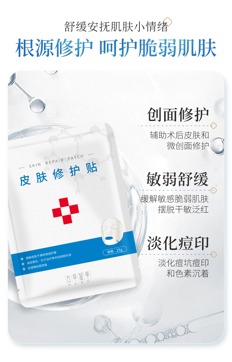 更重要的,古草凝萃在精選以上優(yōu)質成分的基礎上,特別運用了先進的酶切法技術,可以鎖鮮活性精華,遇水煥活,直達肌底補水,有效釋放皮膚修護貼的修護力!
