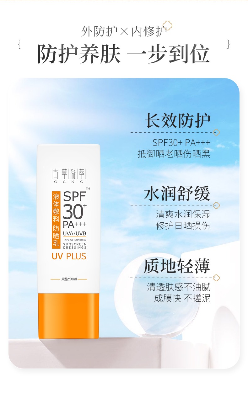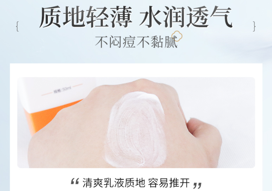 古草凝萃防曬乳質(zhì)地輕薄、水潤透氣,輕揉的涂抹,帶來不黏膩的清爽肌膚使用感,使用后不悶痘不黏膩。