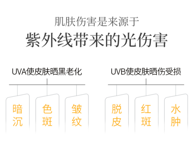 人的皮膚到了一定的階段,就會開始老化,造成皮膚老化的原因有兩個,一個是“歲月的殺手”,這是我們眾所周知且不可控制的。第二個是“光老化”,這是我們可以采取一些手段去控制和預(yù)防的,那就是我們每天要做的防曬。可見光中的紫外線有對人的皮膚有兩個主要的危害,一個UVB是會使我們的皮膚曬傷受損,另一個UVA就是會讓我們的臉上長皺紋,使我們的皮膚失去彈性,流失膠原蛋白。
