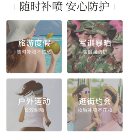 古草凝萃防曬噴霧適用于室內(nèi)室外等場合,一年四季保護肌膚。