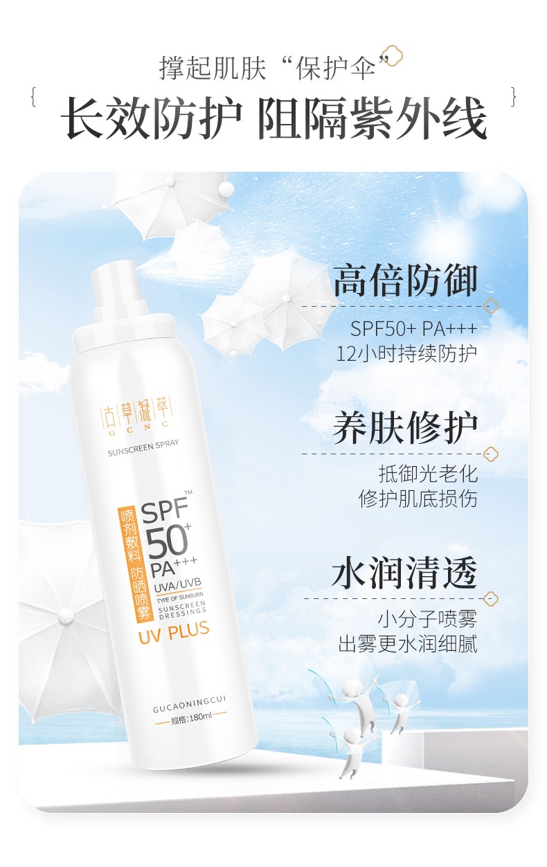 古草凝萃防曬噴霧一瓶相當于防曬、隔離、美白、素顏霜多效功能于一身,均勻吸收后,清爽不油膩,卸妝也方便,正常洗面奶或者沐浴露清洗就可以咯。防水防汗游泳外出一瓶搞定。