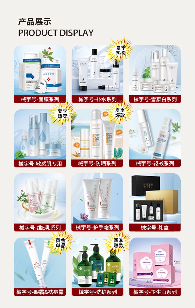 古草凝萃品牌旗下產(chǎn)品非常豐富,有面膜系列、補水系列、防曬系列、驅蚊系列、維E身體乳系列、護手霜系列、洗護系列、衛(wèi)生巾系列等產(chǎn)品!