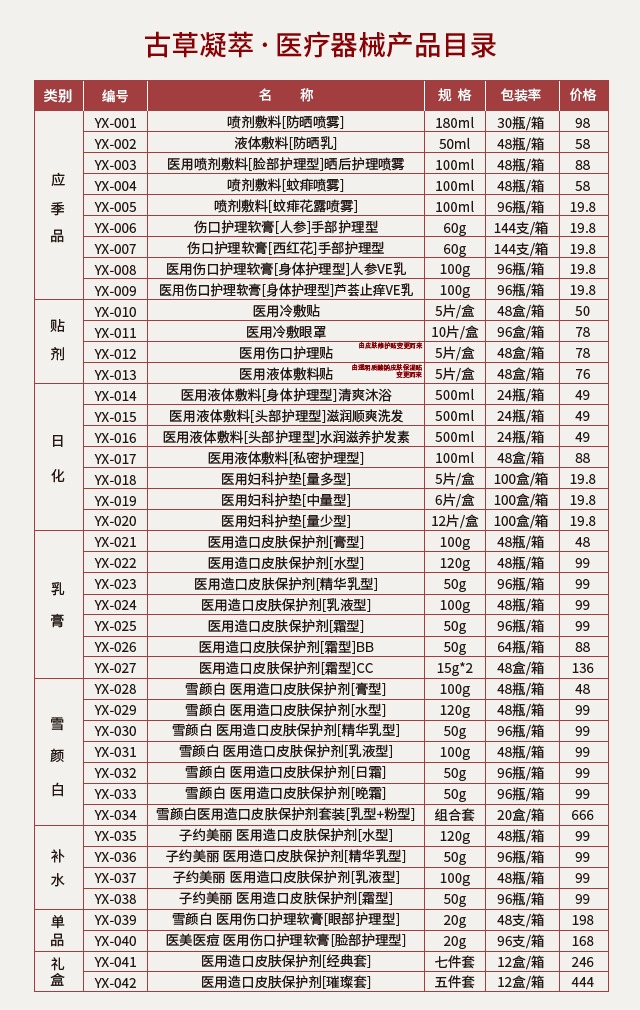 并且古草凝萃品牌旗下的產(chǎn)品在醫(yī)療器械目錄里面也是非常豐富的,分為應季品、貼劑、日化、乳膏等類目。