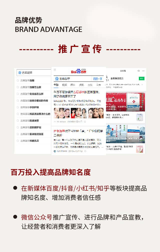 古草凝萃的線下宣傳廣告批文與線上同步推廣宣傳,并加大品牌推廣途徑;從而加速品牌成長速度!