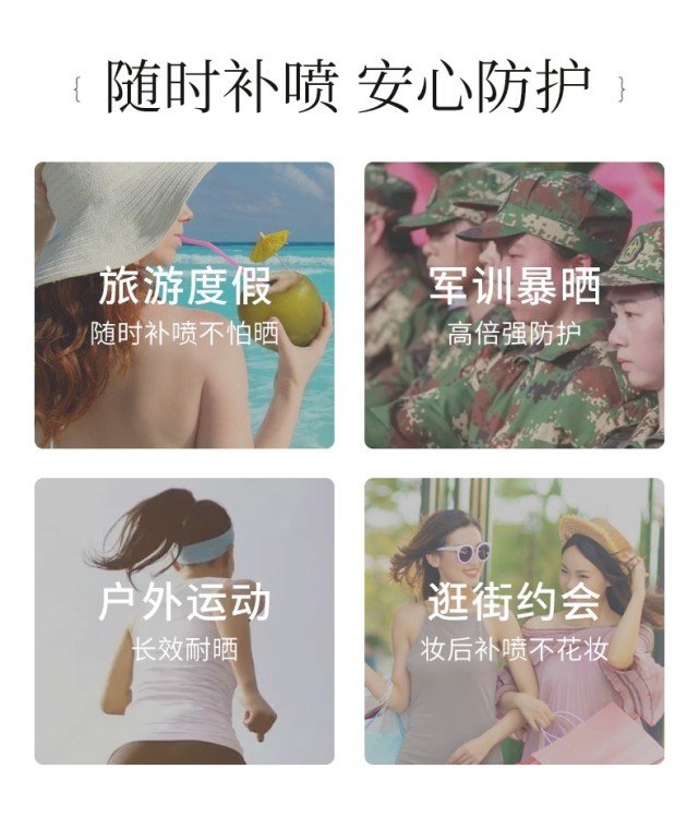 使用前搖一搖,一噴一抹,清爽不粘膩,實(shí)現(xiàn)肌膚呼吸自由,高倍防護(hù)一整天,外出游玩常備!