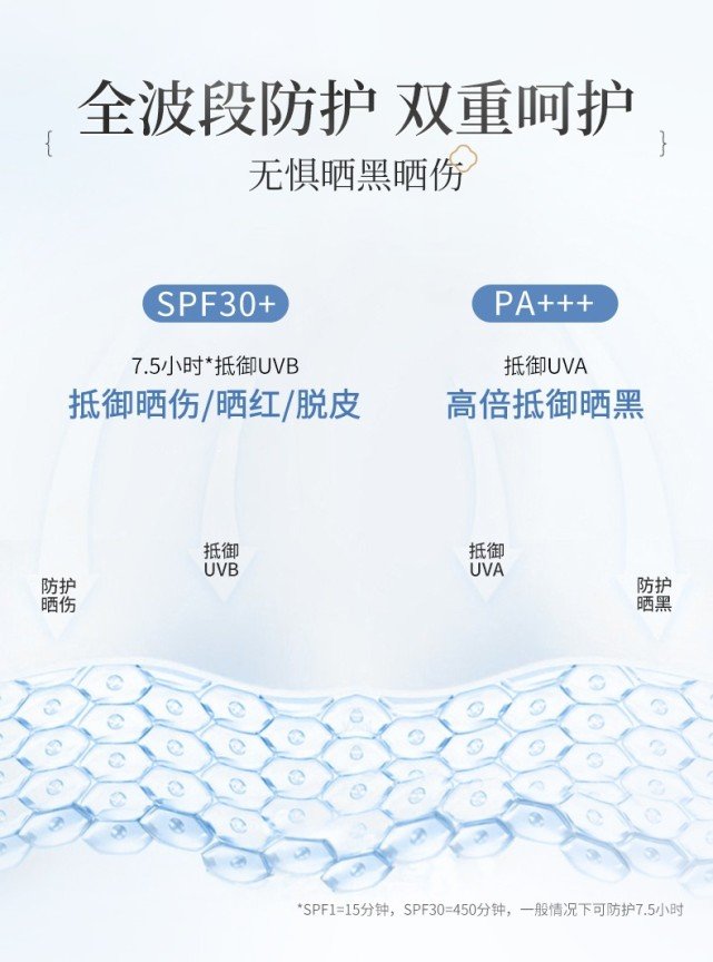 它的防曬指數(shù)是SPF30加上PA+++,可以很好地隔離紫外線中的UVB和UVA,它集美白、隔離和防曬功效三合一,硬核級(jí)防曬!