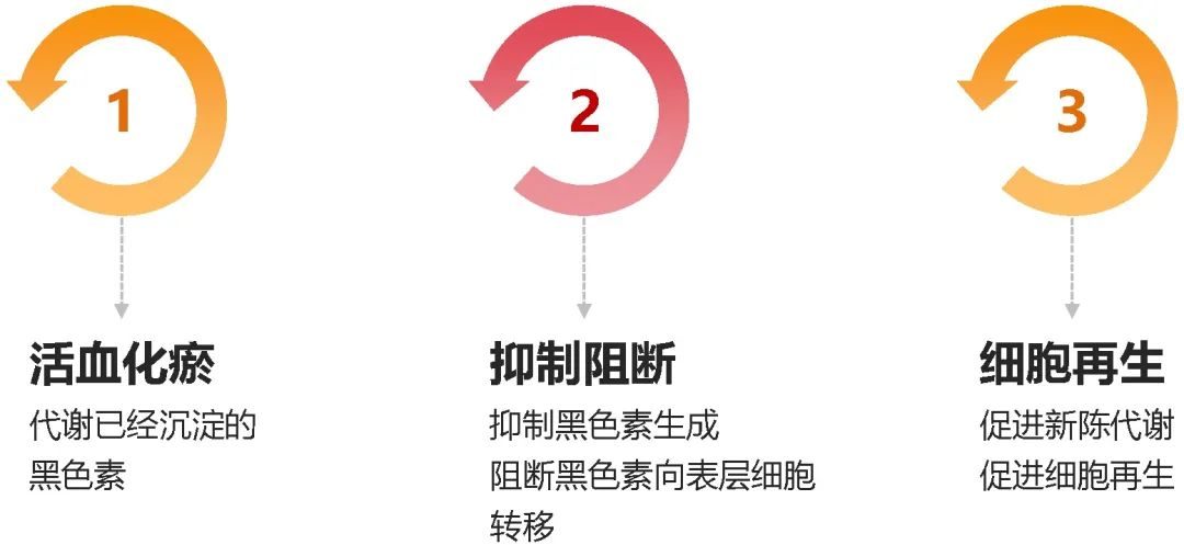 抑制黑色素沉著、抗炎等方面也有很好的療效;減少已經(jīng)生成、沉淀的黑色素,阻隔其向表層細(xì)胞的轉(zhuǎn)移,加速細(xì)胞新陳代謝、加快黑色素角質(zhì)細(xì)胞脫落等。