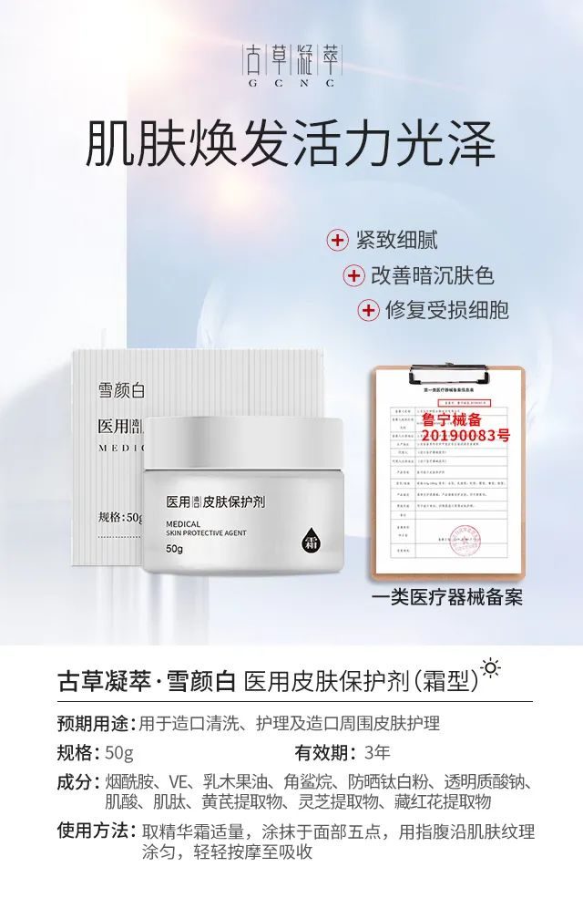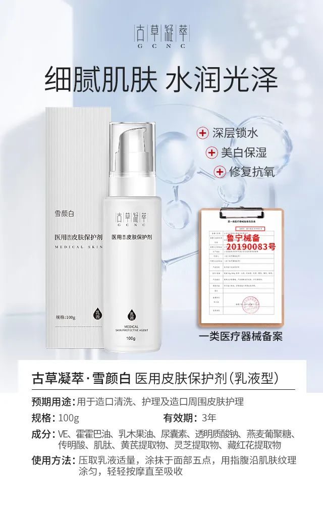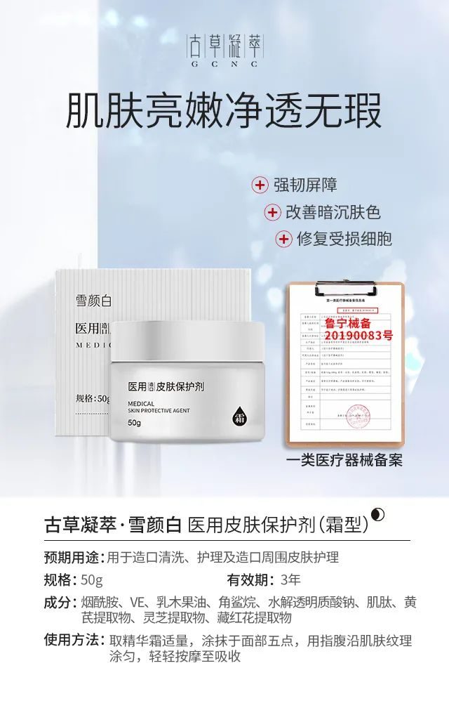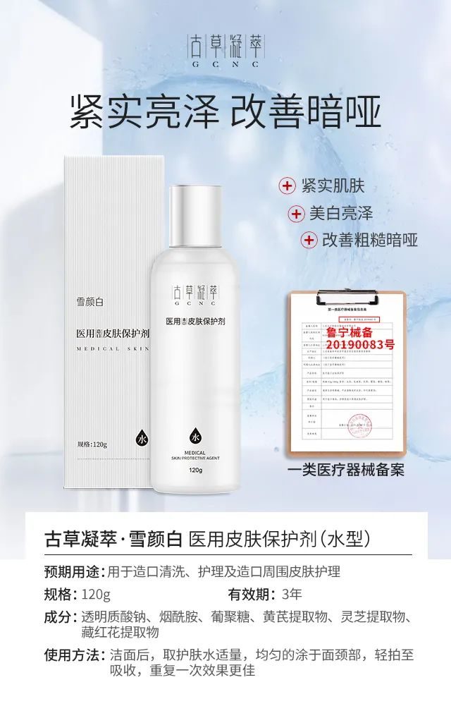 獨(dú)特復(fù)配配方、美白補(bǔ)水神器,采用黃芪、靈芝、藏紅花、煙酸、透明質(zhì)酸等成分,祛斑美白保濕,還原嫩白肌膚,械字號(hào)古草凝萃【雪顏白】五件套一套解決肌膚多重問(wèn)題,醫(yī)用級(jí)別產(chǎn)品,使用更安心,適合**膚質(zhì),源自天然草本的修護(hù)力,祛斑美白補(bǔ)水CP,一套打造年輕水潤(rùn)肌膚!