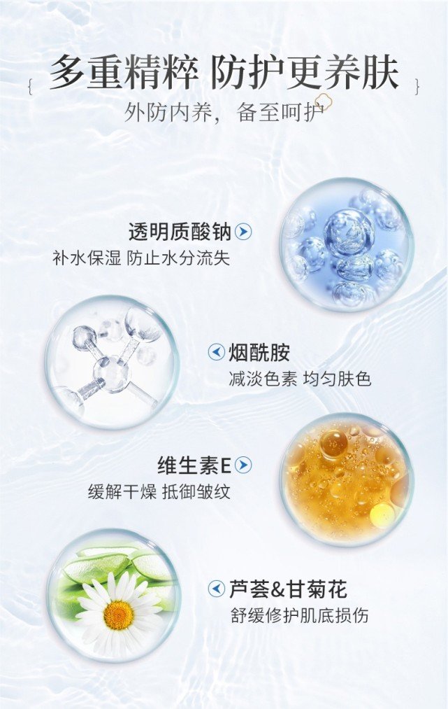 另外,古草凝萃防曬噴霧蘊含透明質(zhì)酸鈉、煙酰胺、維生素E、蘆薈、甘菊花等多重精粹成分,具有亮膚保濕功效,美顏又美。
