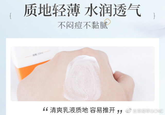 古草凝萃防曬乳質(zhì)地輕薄、水潤透氣、帶來不黏膩的清爽肌膚使用感,使用后不悶痘不黏膩。
