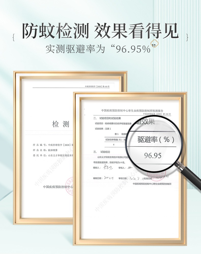 更重要的,古草凝萃蚊痱噴霧具備權(quán)威部門---中國疾病預(yù)防控制中心的檢測報告!實測驅(qū)避率高達(dá)96.95%!