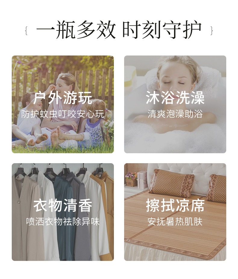 古草凝萃蚊痱噴霧具多種功效,能時刻守護(hù)你的健康!除了驅(qū)蚊,它可以在沐浴的時候噴入水中,沐浴驅(qū)蚊兩不誤,給全身清爽的感覺!還可以噴灑在衣物上祛除異味,在夏季擦拭涼席,安撫暑熱肌膚!