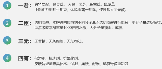綜上所述,古草凝萃[子約美麗]補水爆款系列采用中藥復方、生物科技研制,復配參靈草、透明質(zhì)酸、人參、靈芝、積雪草等優(yōu)質(zhì)成分,具深層補水保濕、抗衰緊致、舒緩修護等多重功效!